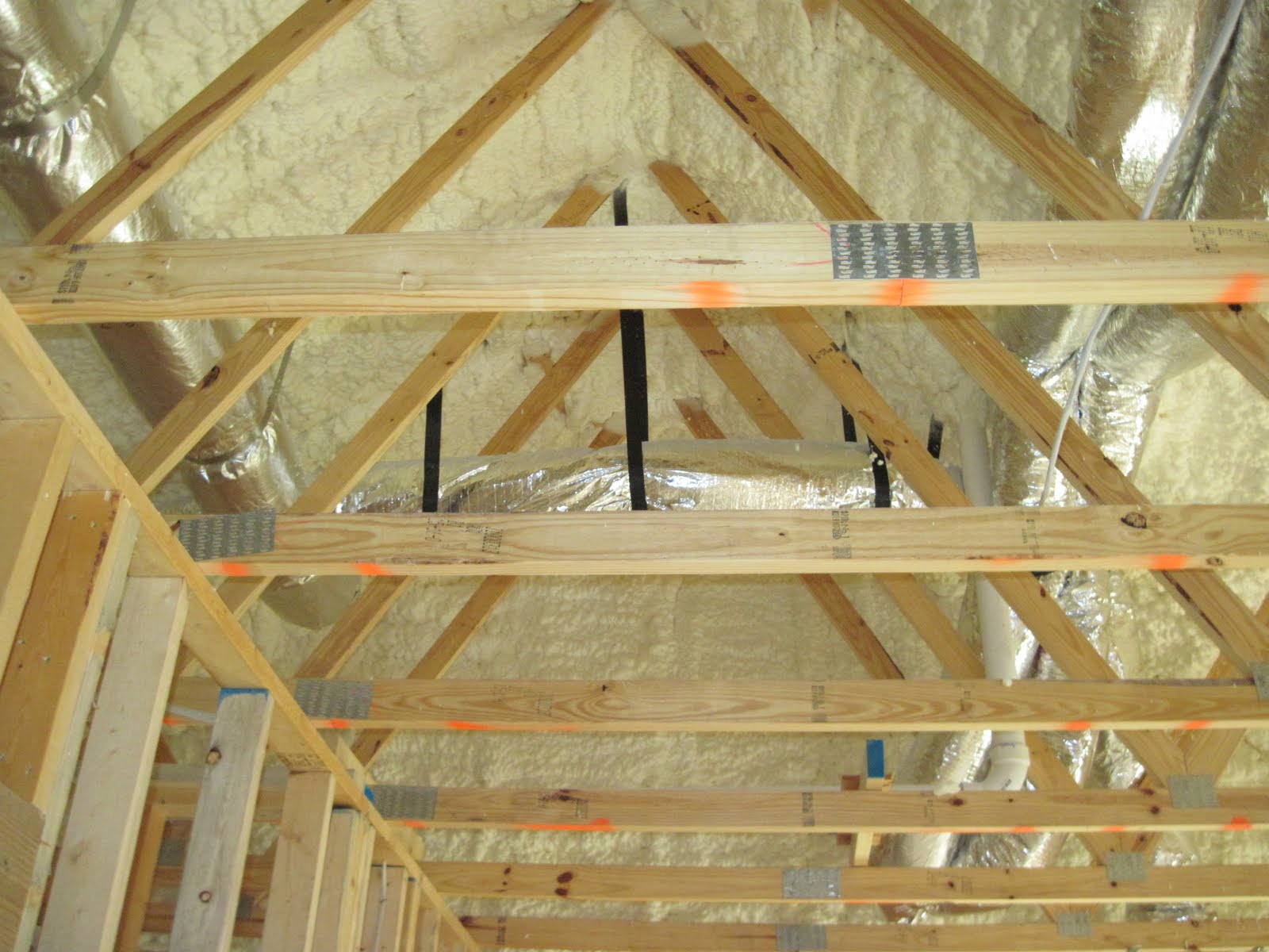 стін каркасного будинку, які неможливо ефективно закрити утеплювачами у вигляді панелей; - Підвищення міцності. Навіть тонкий шар ППУ надає додаткову жорсткість всій конструкції;